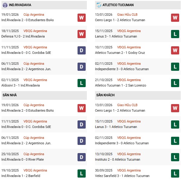 - Trên sân nhà, Rivadavia thắng 2, thua 1 trước Atletico Tucuman.
