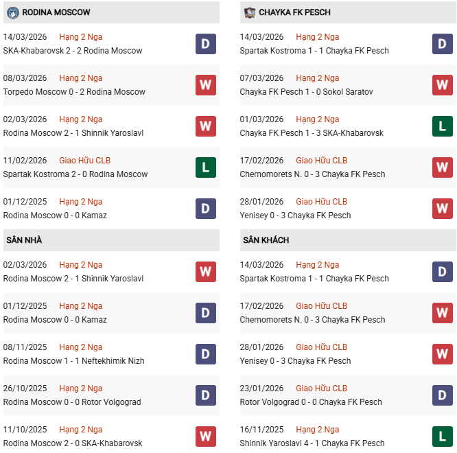 Thống kê phong độ Rodina Moscow vs Chayka: