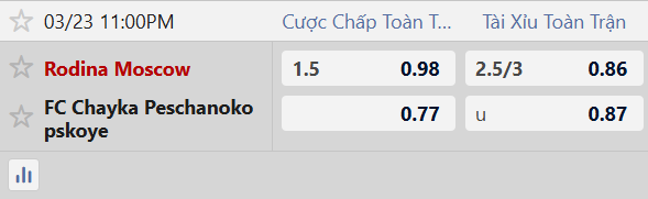 Thông tin tỷ lệ cược Rodina Moscow vs Chayka: