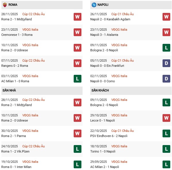 - Roma thắng 1, hòa 3, thua 6 trong 10 trận gặp Napoli gần đây.