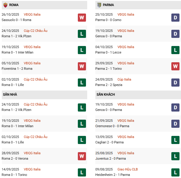 - Trên sân nhà, Roma thắng 8, hòa 2 trước Parma.
