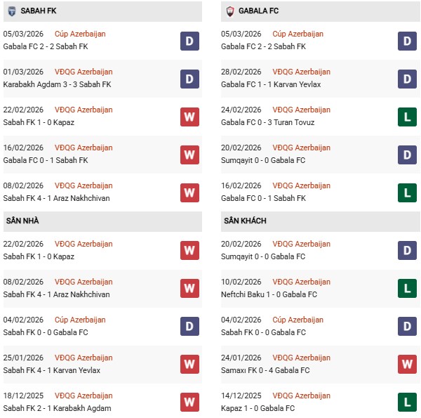- Sabah FK thắng 5, hòa 3, thua 2 trong 10 trận gặp Gabala gần đây.