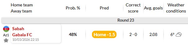 Việc Sabah chấp tới 1 1/2 bàn phản ánh rõ sự chênh lệch về đẳng cấp và phong độ giữa hai đội. Với thành tích sân nhà gần như tuyệt đối cùng phong độ ổn định, đội đầu bảng hoàn toàn có thể áp đặt thế trận ngay từ đầu. Trong khi đó, Gabala thường xuyên gặp khó khăn mỗi khi thi đấu xa nhà và hàng thủ của họ cũng không thực sự chắc chắn. Trước đối thủ mạnh như Sabah, việc giành điểm sẽ là nhiệm vụ không hề dễ dàng đối với đội khách.