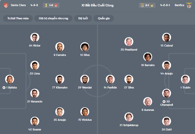 Số liệu thống kê về Santa Clara gặp Benfica: