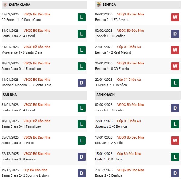 - Trên sân nhà, Santa Clara hòa 2, thua 6 trước Benfica.