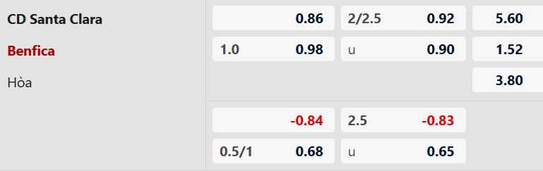 Thông tin tỷ lệ kèo Santa Clara vs Benfica: