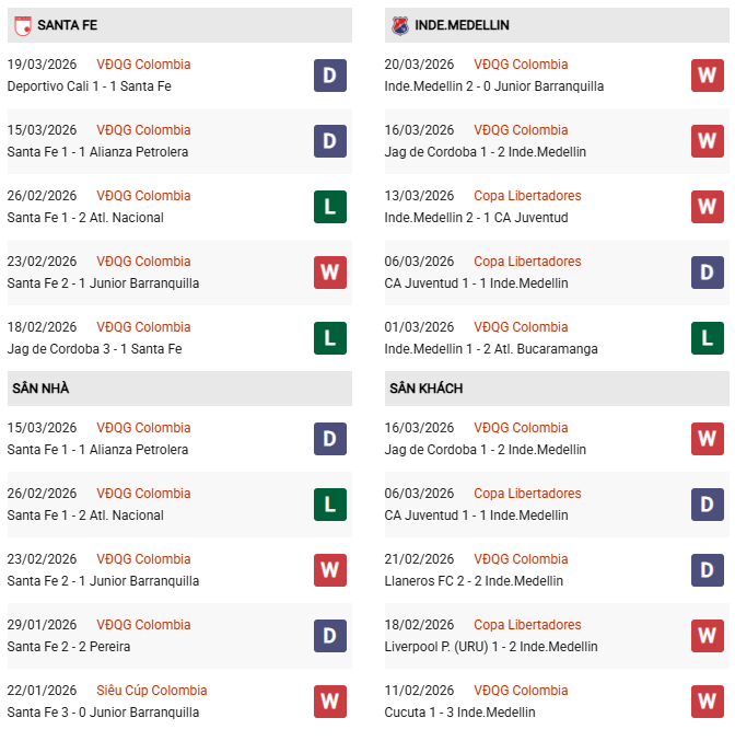 Trái ngược với sự bất ổn của chủ nhà, Independiente Medellin (Inde. Medellin) lại đang thể hiện một phong độ cực kỳ thăng hoa và bản lĩnh ở cả đấu trường quốc nội lẫn châu lục. Trong 5 trận gần nhất, đội bóng này sở hữu thành tích bất bại ấn tượng với 3 chiến thắng và 2 trận hòa. Đặc biệt, chiến thắng thuyết phục 2-0 trước Junior Barranquilla vào ngày 20/03 vừa qua đã khẳng định sức mạnh tấn công đáng gờm của họ. Khả năng thi đấu xa nhà của Medellin cũng là một điểm tựa vững chắc cho các nhà đầu tư, khi họ đang có chuỗi 6 trận sân khách bất bại liên tiếp (4 thắng, 2 hòa). Với sự tự tin cao độ sau khi đánh bại Jag de Cordoba 2-1 trên sân khách và duy trì mạch ghi bàn ấn tượng, Medellin đang là đội sở hữu tâm lý và phong độ lấn lướt hoàn toàn trước chuyến hành quân tới sân của Santa Fe.
