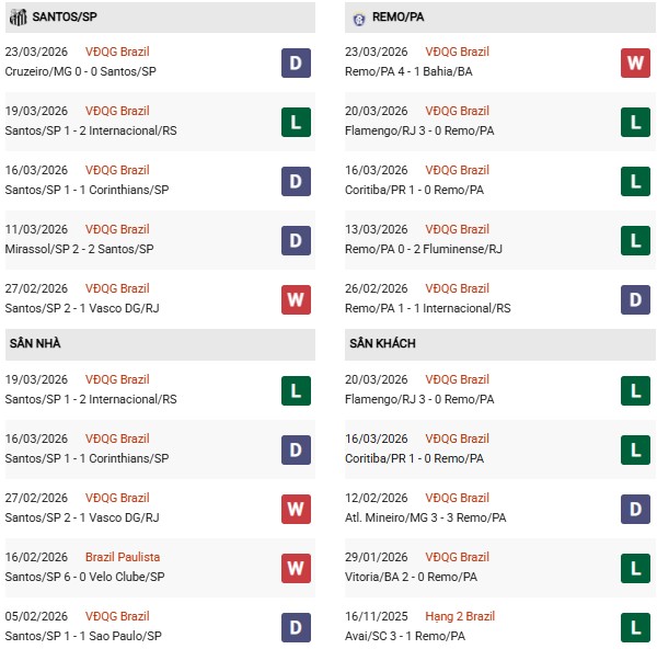 Thống kê phong độ Santos vs Remo: