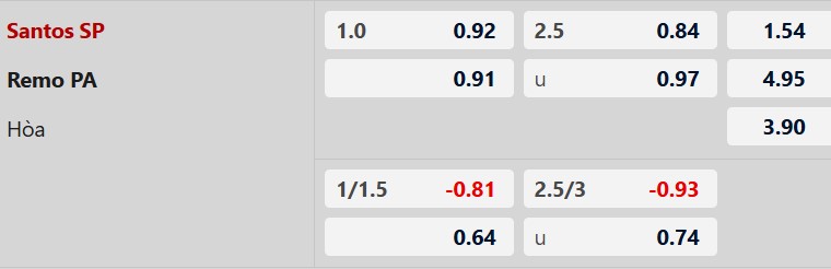 Santos chấp 1 bàn là mức kèo khá cao nếu nhìn vào phong độ hiện tại, nhưng lợi thế sân nhà cùng việc Remo chơi sân khách rất yếu là cơ sở để tin vào đội chủ nhà. Santos nhiều khả năng sẽ tận dụng tốt cơ hội này để giải tỏa áp lực bằng một chiến thắng.