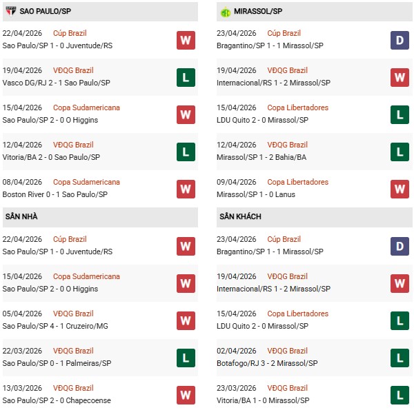 - Sao Paulo thắng 4, hòa 2, thua 4 trong 10 trận gặp Mirassol gần đây.