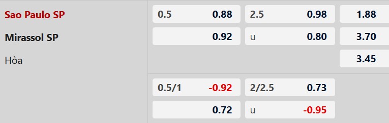 Thông tin tỷ lệ Sao Paulo vs Mirassol:
