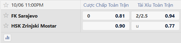 Thông tin tỷ lệ Sarajevo vs Zrinjski Mostar: