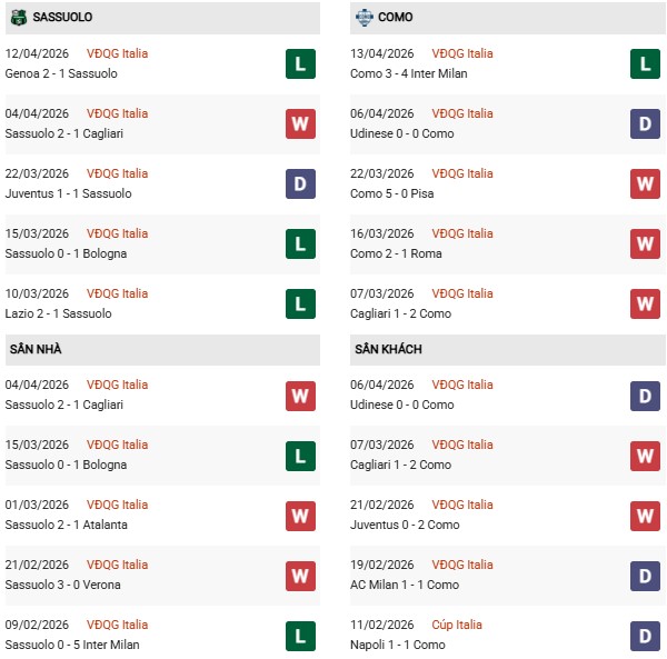 - Sassuolo toàn thua cả 2 trận đối đầu Como gần đây.