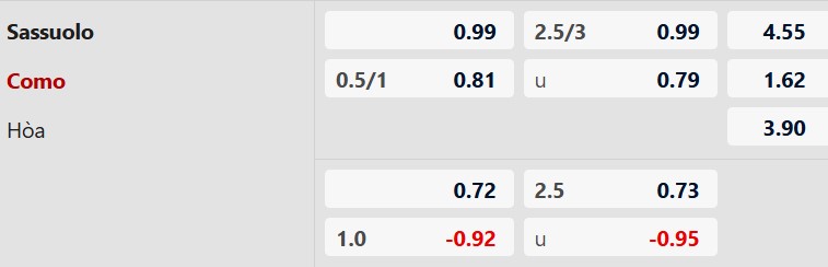 Como chấp 3/4 bàn cho thấy giới chuyên gia đánh giá cao động lực và chất lượng đội hình của đội khách. Trước một Sassuolo thi đấu thiếu ổn định và không còn nhiều mục tiêu, Como là lựa chọn đáng tin hơn.