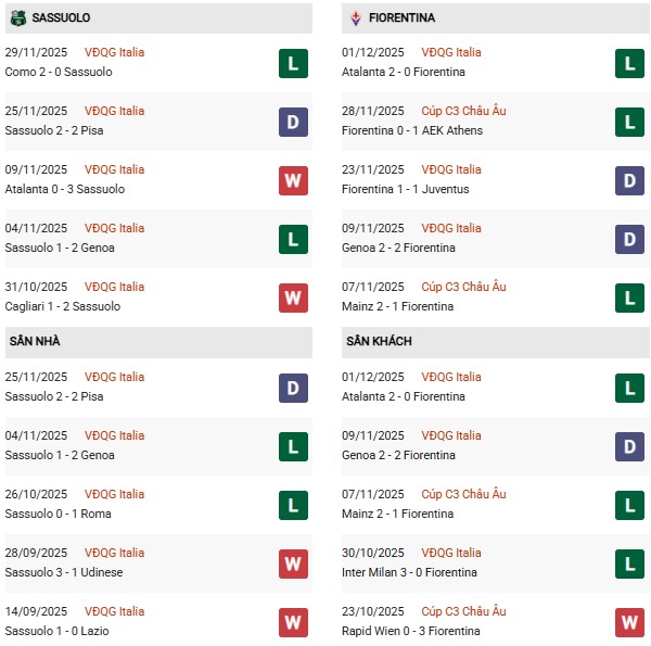 Thống kê phong độ Sassuolo vs Fiorentina: