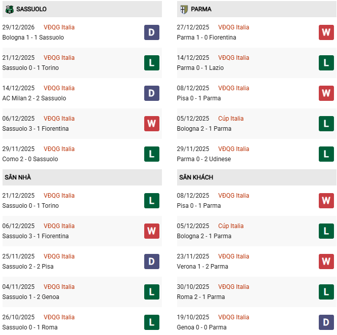 - Trên sân nhà, Sassuolo thắng 1, thua 2 trước Parma.