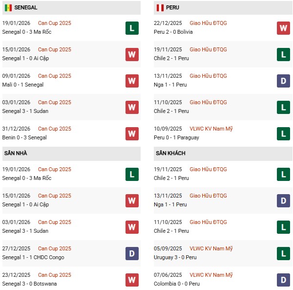 Thống kê phong độ Senegal vs Peru: