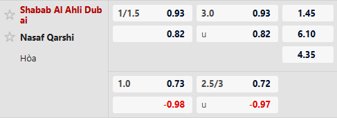 Lựa chọn tốt nhất: Shabab Al Ahli -1 1/4 cả trận