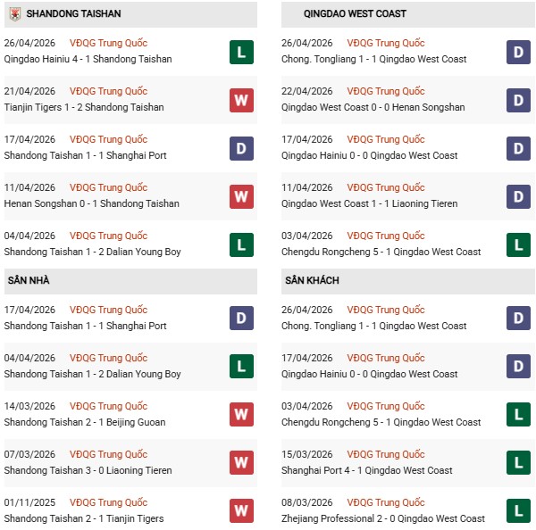 Thành tích đối đầu Shandong vs Qingdao West Coast: