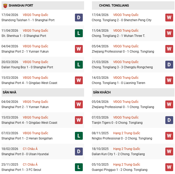 Thống kê phong độ Shanghai Port vs Chongqing Tonglianglong:
