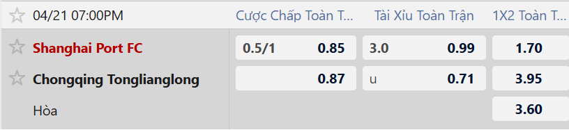 Thông tin tỷ lệ kèo Shanghai Port vs Chongqing Tonglianglong: