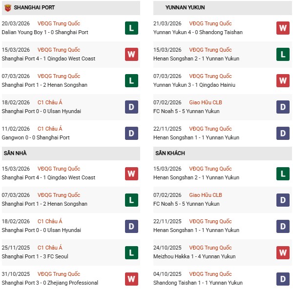 - Shanghai Port toàn thắng cả 2 trận đối đầu Yunnan Yukun gần đây.