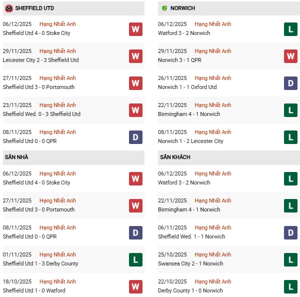 Trên sân nhà, phong độ của họ chưa quá thuyết phục với 4 thắng, 1 hòa và 5 thua trong 10 trận gần đây. Tuy nhiên, vẫn phải nhấn mạnh rằng những trận sân nhà gần nhất của Sheffield United cho thấy tín hiệu tích cực hơn khi họ thi đấu kỷ luật và hiệu quả trong pressing tầm cao. Gặp Norwich – đội bóng đang rơi tự do sẽ là cơ hội tốt để Sheffield United cải thiện thứ hạng.