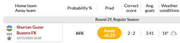 Rất bất ngờ khi Shurtan Guzar lại được đánh giá cao hơn trận này với kèo chấp 1/4 bàn. Nhiều khả năng mức chấp này đến từ lợi thế đôi chút về ưu thế sân nhà. Tuy vậy, Buxoro vẫn được đánh giá cao ở khả năng giành chiến thắng nhờ phong độ tốt hơn và sự ổn định trong lối chơi. Còn Shurtan thua 5/6 trận gần nhất và cho thấy quá nhiều vấn đề cả trong tấn công lẫn phòng ngự.