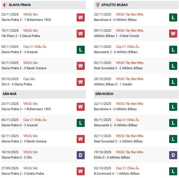 Trong khi Slavia Praha thắng 4/5 trận mới nhất thì Bilbao thắng 1/5 trận vừa qua. Slavia Praha có lợi thế sân nhà và đang chơi cực hay ở đây khi chỉ thua 1/5 trận gần đây