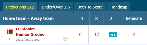 Trái ngược với đối thủ, Neman Grodno đang cho thấy dấu hiệu khởi sắc. Họ vừa có chiến thắng tưng bừng 4-1 trước FC Minsk, giúp toàn đội lấy lại tinh thần sau chuỗi trận không như ý. Dù phong độ chưa quá ổn định, nhưng so về đẳng cấp, Neman Grodno vẫn vượt trội hoàn toàn so với Slonim.