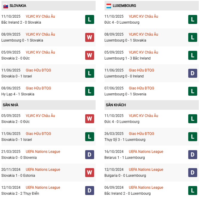 Thống kê phong độ Slovakia vs Luxembourg:
