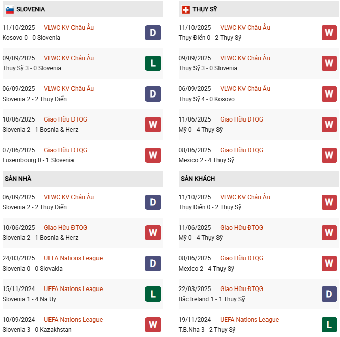 - Trên sân nhà, Slovenia thắng 1, thua 2 trước Thụy Sĩ.