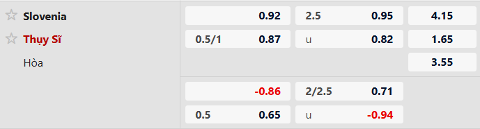 Thụy Sĩ chấp 3/4 bàn cho cả trận. Ở thời điểm hiện tại, Slovenia đã tịt ngòi trong 2 trận gần nhất, và hàng công của họ cho thấy sự bế tắc rõ rệt. Ngược lại, Thụy Sĩ đang duy trì phong độ ấn tượng với chuỗi thắng liên tiếp. Với sự tự tin, đội bóng của HLV Murat Yakin hoàn toàn có thể nối dài mạch toàn thắng bằng một kết quả thuyết phục ngay trên đất Slovenia.