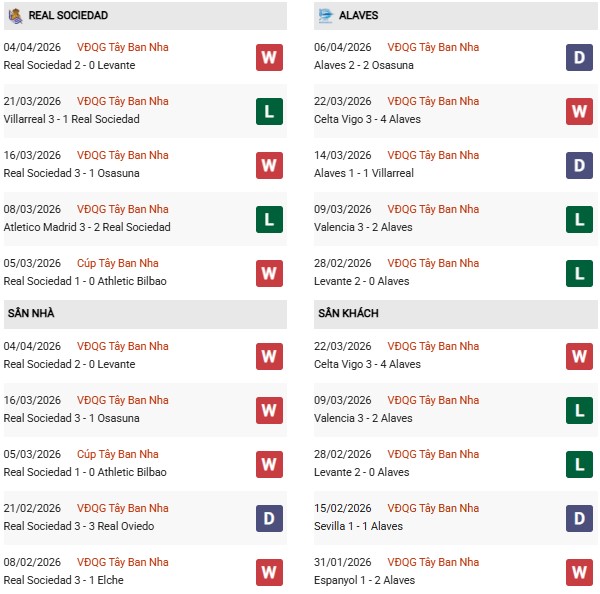 Thống kê phong độ Sociedad vs Alaves: