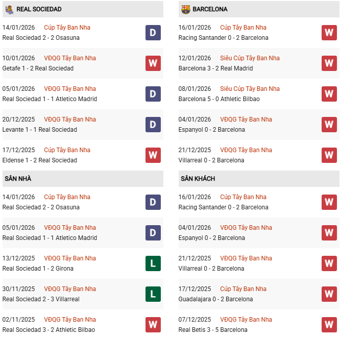 Thống kê phong độ Sociedad vs Barcelona: