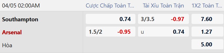 Thông tin tỷ lệ kèo bóng đá Southampton vs Arsenal:
