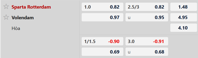 Thông tin tỷ lệ kèo Sparta Rotterdam vs Volendam:
