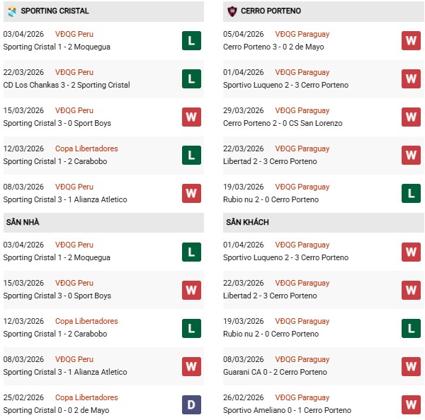 Thống kê phong độ Sporting Cristal vs Cerro Porteno: