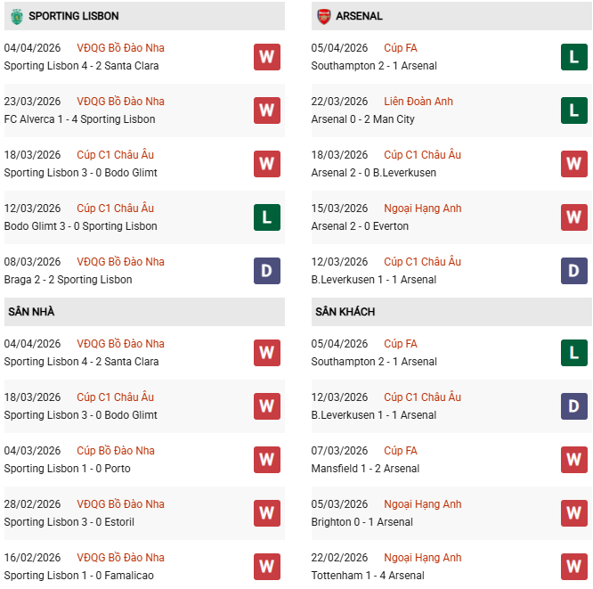 Thống kê phong độ Sporting Lisbon vs Arsenal: