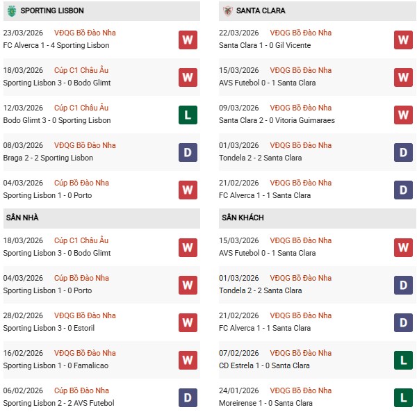 - Trên sân nhà, Sporting Lisbon thắng 6, thua 1 trước Santa Clara.