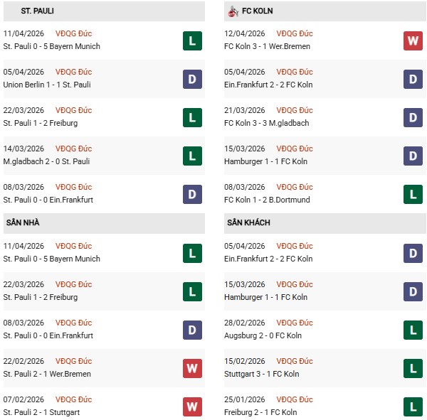 - St. Pauli thắng 1, hòa 3, thua 6 trong 10 trận gặp FC Koln gần đây.