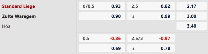 Thông tin tỷ lệ kèo Standard Liege vs Zulte Waregem: