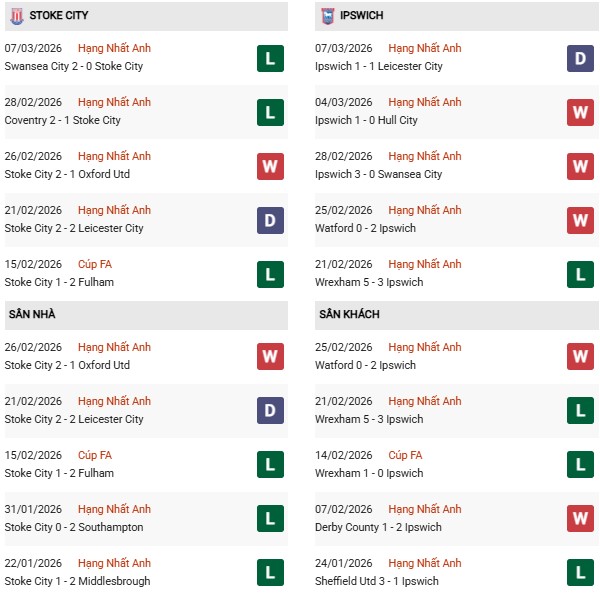 Phong độ của Stoke vs Ipswich đang có sự chênh lệch vào thời gian này. Trong khi Stoke chỉ thắng 1/10 trận gần nhất thì Ipswich thắng 5/10 trận vừa xong.