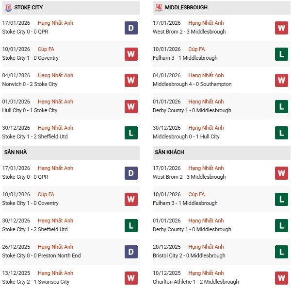 - Trên sân nhà, Stoke thắng 4, thua 2 trước Middlesbrough.