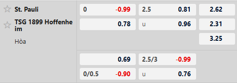 Nhận định St.Pauli vs Hoffenheim, 02h45 ngày 29/10, vòng 2 Cúp QG Đức, sân Millerntor. Hoffenheim được đánh giá nhỉnh hơn một chút (-0 hoặc -1/4), đây là điểm tích cực cho thấy Die Kraichgauer đang nhận được tín nhiệm cao từ giới chuyên môn.