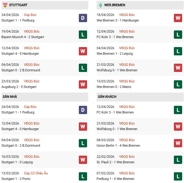 Số liệu thống kê về Stuttgart gặp Werder Bremen: