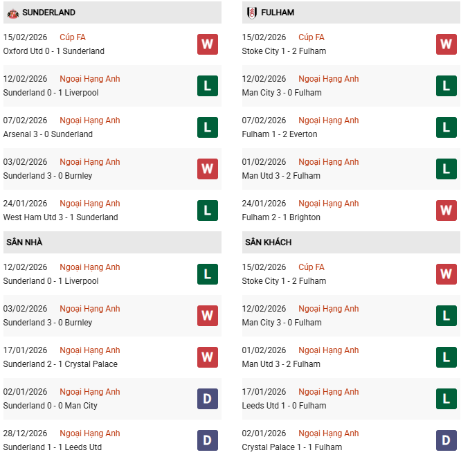 Thống kê phong độ Sunderland vs Fulham: