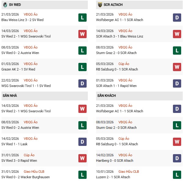 - SV Ried thắng 3, hòa 3, thua 4 trong 10 trận gặp Altach gần đây.
