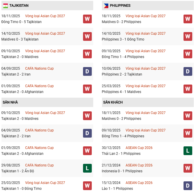 - Tajikistan thắng 1, hòa 3, thua 4 trong 8 trận gặp Philippines gần đây.