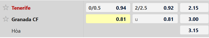 Thông tin tỷ lệ kèo Tenerife vs Granada: